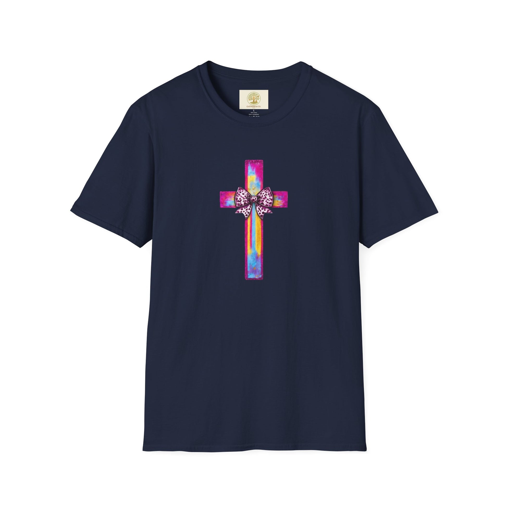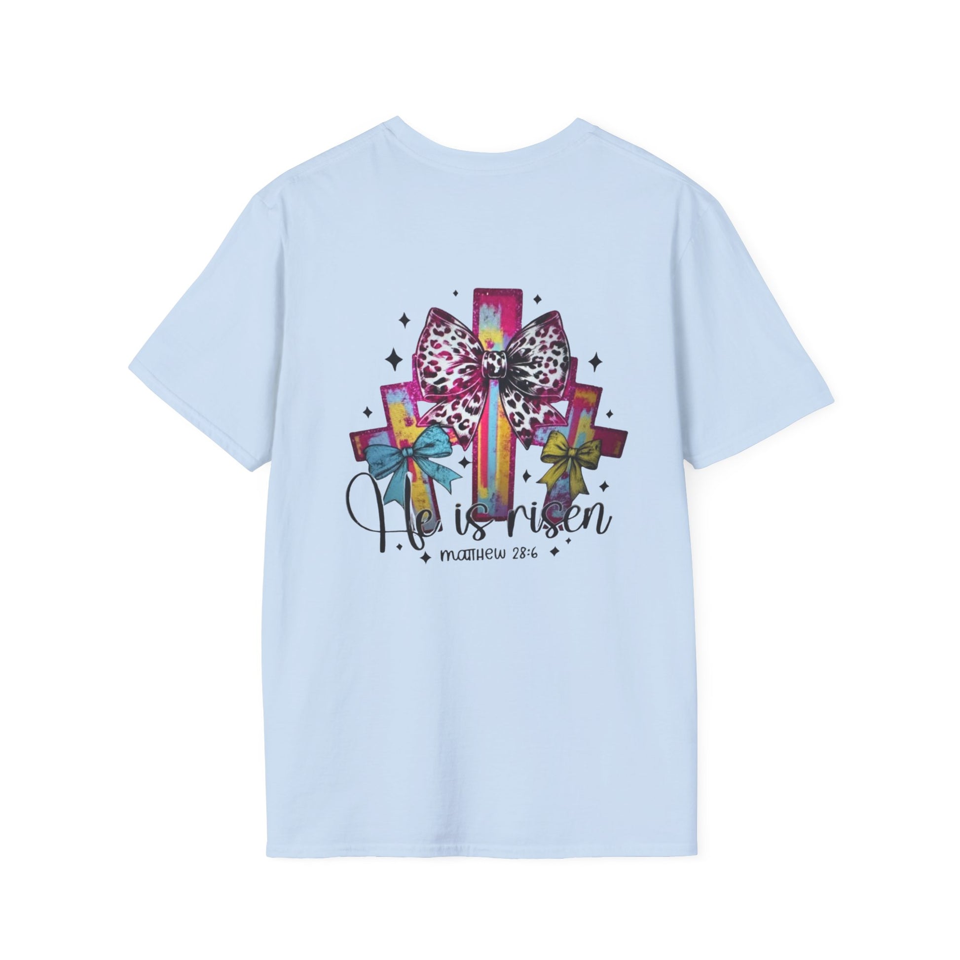 He Is Risen Christian Cross T-Shirt – Colorful Bow Cross Design | Matthew 28:6 Faith Tee